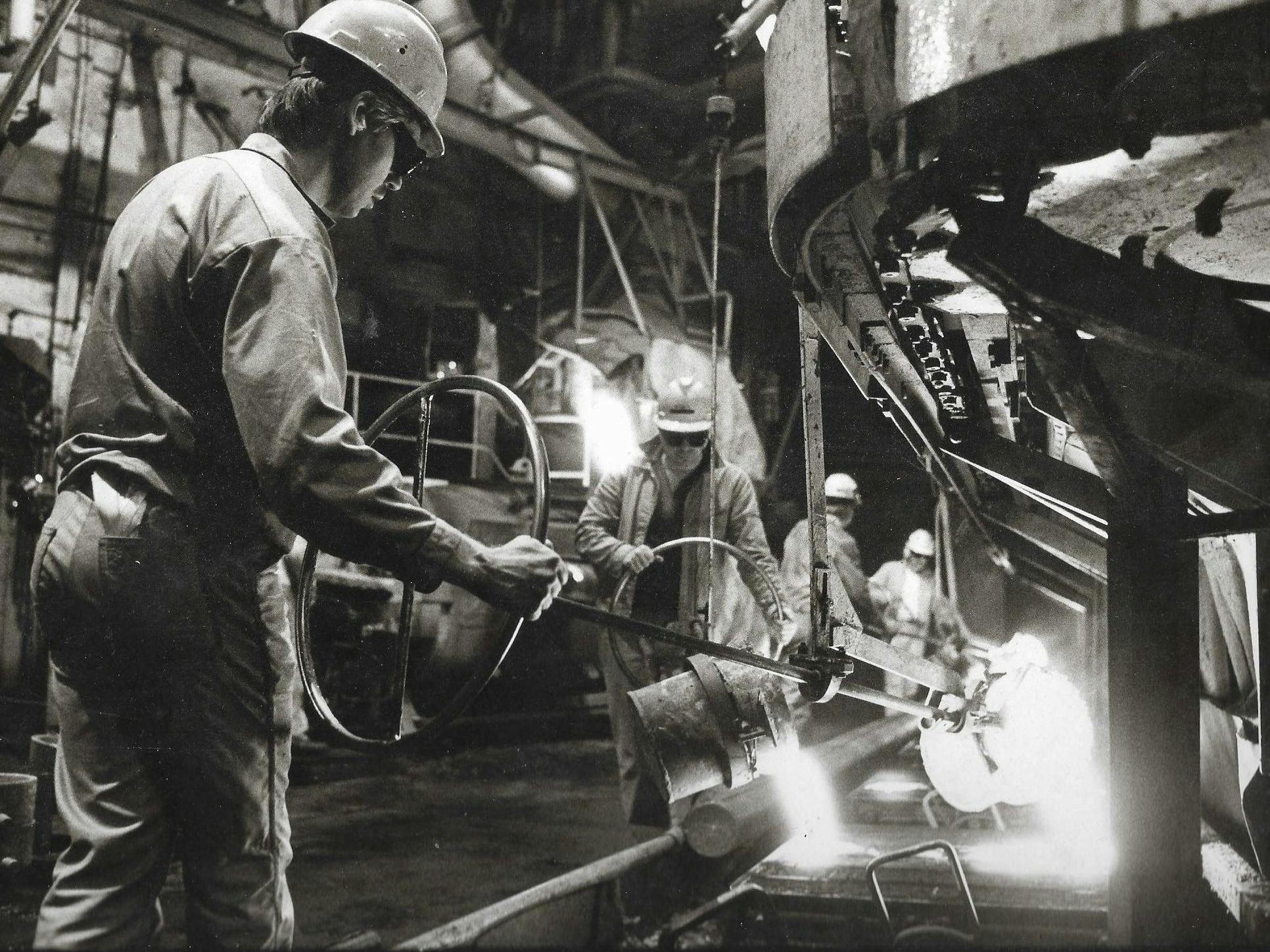 Warren Brodey and his comrades at the iron foundry, late 1970s.